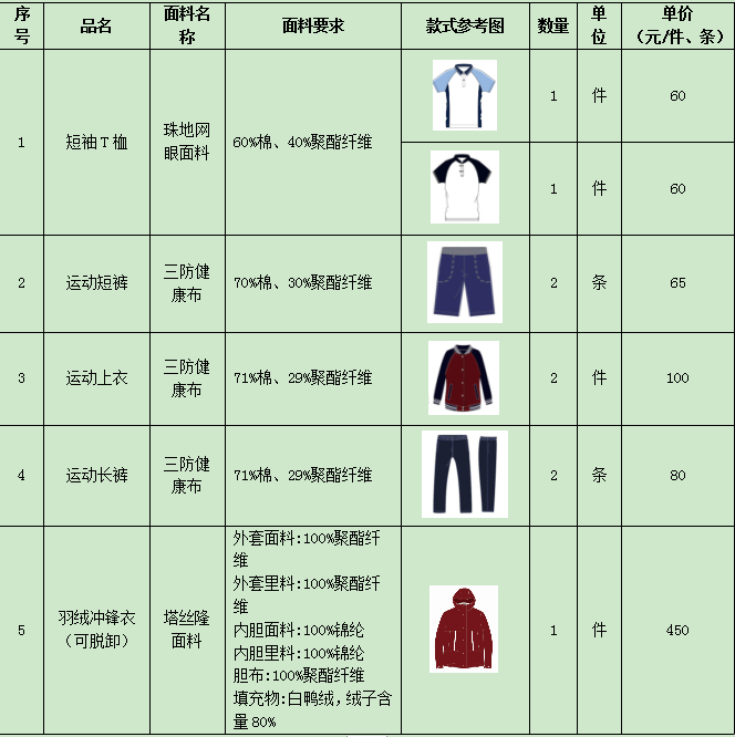 名稱:見附件。 品牌:喬治白。 規(guī)格參數(shù):見附件。 數(shù)量:見附件,按實(shí)結(jié)算。 價(jià)格:1060元/套。 服務(wù)年限:兩年,合同一年一簽,經(jīng)采購(gòu)人考核滿意后,方可續(xù)簽下一年合同。 質(zhì)量標(biāo)準(zhǔn):所有檢測(cè)指標(biāo)必須符合國(guó)家相關(guān)標(biāo)準(zhǔn)及本次采購(gòu)項(xiàng)目的技術(shù)要求,檢驗(yàn)依據(jù)GB 31701-2015《嬰幼兒及兒童紡織產(chǎn)品安全技術(shù)規(guī)范》,GB/T 31888-2015《中小學(xué)生校服》,GB18401-2010《國(guó)家紡織產(chǎn)品基本安全技術(shù)規(guī)范》。生產(chǎn)過程中,如果有相關(guān)新標(biāo)準(zhǔn)出臺(tái),則釆用新標(biāo)準(zhǔn)。沒有提及的標(biāo)準(zhǔn)參照國(guó)家和地方相關(guān)最新標(biāo)準(zhǔn)。 售后服務(wù):1、免費(fèi)質(zhì)保期1年,自物品驗(yàn)收合格之日起(采購(gòu)人代表在驗(yàn)收?qǐng)?bào)告上簽字之日起計(jì)算)至少12個(gè)月內(nèi)正常使用,對(duì)非人為因素?fù)p壞的服裝,承諾無條件負(fù)責(zé)更換。 2、嚴(yán)格按照國(guó)家“三包”政策供貨,在投入使用后至少一年內(nèi),進(jìn)行售后跟蹤,提供7*24小時(shí)售后服務(wù),出現(xiàn)質(zhì)量問題,將在24小時(shí)內(nèi)解決或提供解決方案。 |