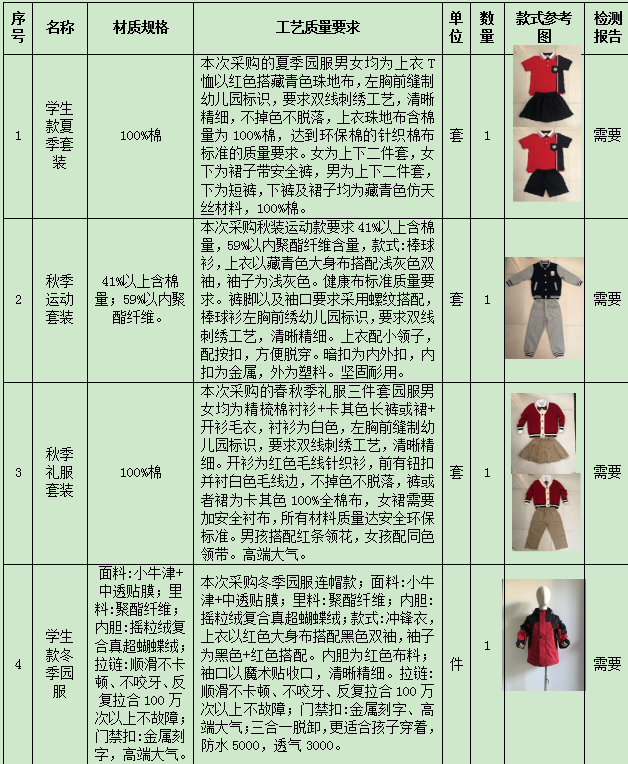 5.項目概況:本項目為常州市新北區(qū)新港幼兒園園服采購項目,包括園服制作、運抵、卸貨至采購人現(xiàn)場指定位置,通過采購人及其他相關部門的驗收,直至發(fā)放和余貨取回等全過程工作。其中每套園服包含:夏季套裝1套,秋季運動套裝1套、秋季禮服套裝1套、冬季園服1件。成交單位需等到采購人新生報到,征得2/3以上家長同意后,雙方才履行合同,采購人負責將采購款式、數(shù)量交予成交單位,成交單位按照采購人提供的款式、顏色要求制造校服,校服面料必須與采購需求中一致。貧困學生校服征訂工作按教育主管部門相關文件執(zhí)行。成交單位還需要承擔其他班級園服的增訂工作,具體數(shù)量價格按照現(xiàn)有標準實行。